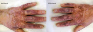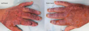 Bệnh nhân than phiền da rất khô và cảm thấy ngứa ở khuôn mặt và bàn tay. Da của bệnh nhân cảm thấy cực kỳ căng sau bỏng và bàn tay bị phù nề nặng.